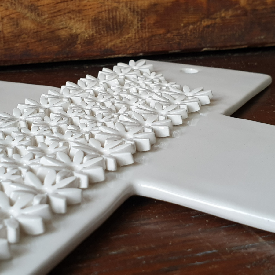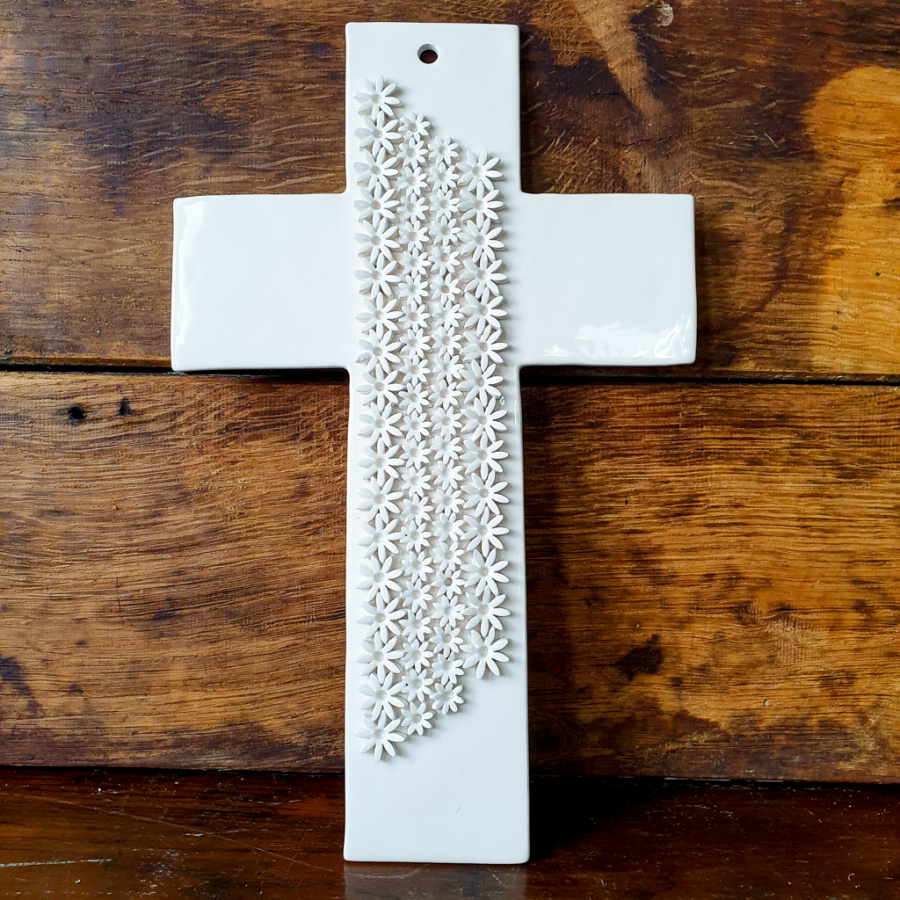 Križ je ročno delo in je narejen iz bele gline. Je glaziran z prozorno sijajno glazuro. Je čudovito darilo pri poroki, rojstvu otroka, svetem obhajilu, birmi ali ob obletnicah. Shranjen je v ročno izdelani škatli smetanove barve , ki je na notranji strani obložena s svilo v rjavi barvi. Torej vam ni potrebno skrbeti za zavijanje darila, ker je le to že pripravljeno.