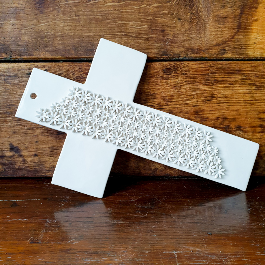 Križ je ročno delo in je narejen iz bele gline. Je glaziran z prozorno sijajno glazuro. Shranjen je v ročno izdelani škatli smetanove barve , ki je na notranji strani obložena s svilo v rjavi barvi.