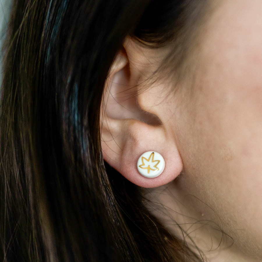 Uhani so ročno delo in so narejeni iz gline. So glazirani s prozorno glazuro. Dodatno pa je nanešen še okrasni detajl iz 10 % zlata. Ostale komponente so iz nerjavečega jekla. Velikost: 10 mm. Unikatni nakit iz gline je lahko čudovito in domiselno darilo za ženske ob različnih priložnostih. Razveselite dame za rojstni dan, za god, uporabite ga za poslovno darilo ali pa preprosto obdarite sebe.