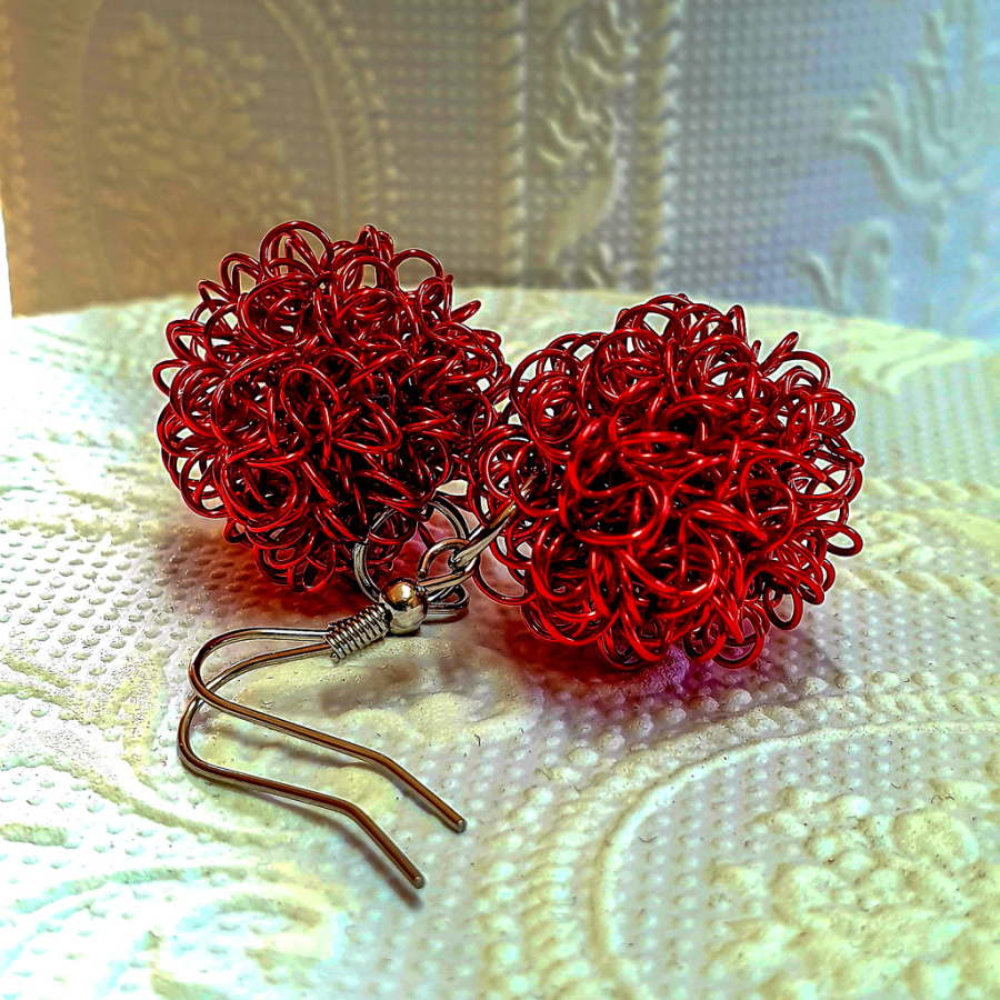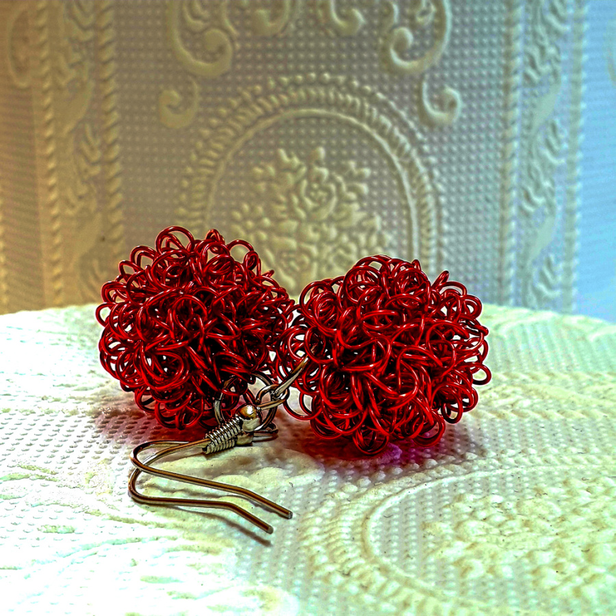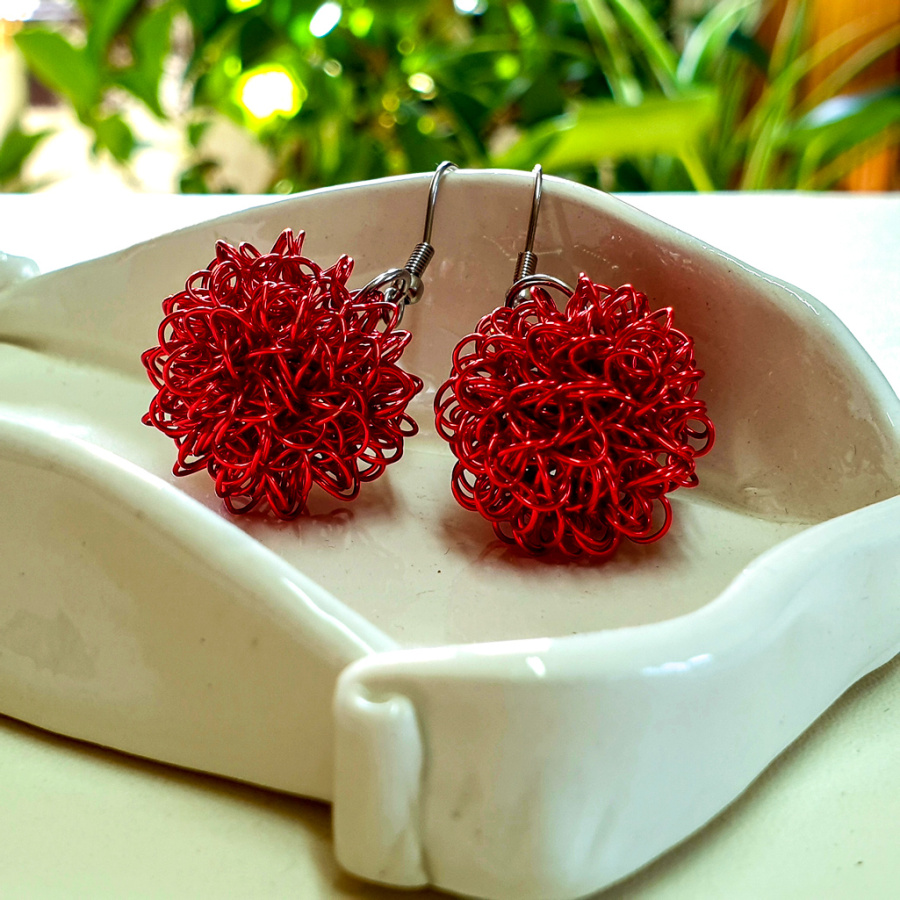 Uhani so ročno narejeni iz barvne žice in nerjavečega jekla.
