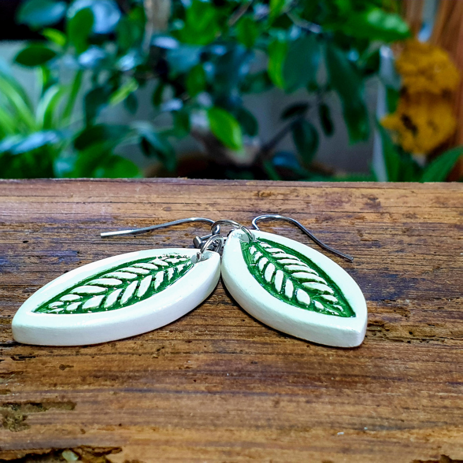 Uhani so ročno delo in so narejeni iz gline. Ostale komponente so iz nerjavečega jekla.