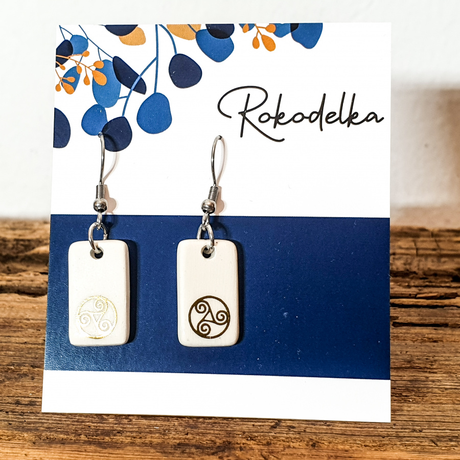 Uhani so ročno delo in so narejeni iz gline. So glazirani s prozorno glazuro. Dodatno pa je nanešen še okrasni detajl iz 10 % zlata. Ostale komponente so iz nerjavečega jekla. Velikost 15 x 8 mm.