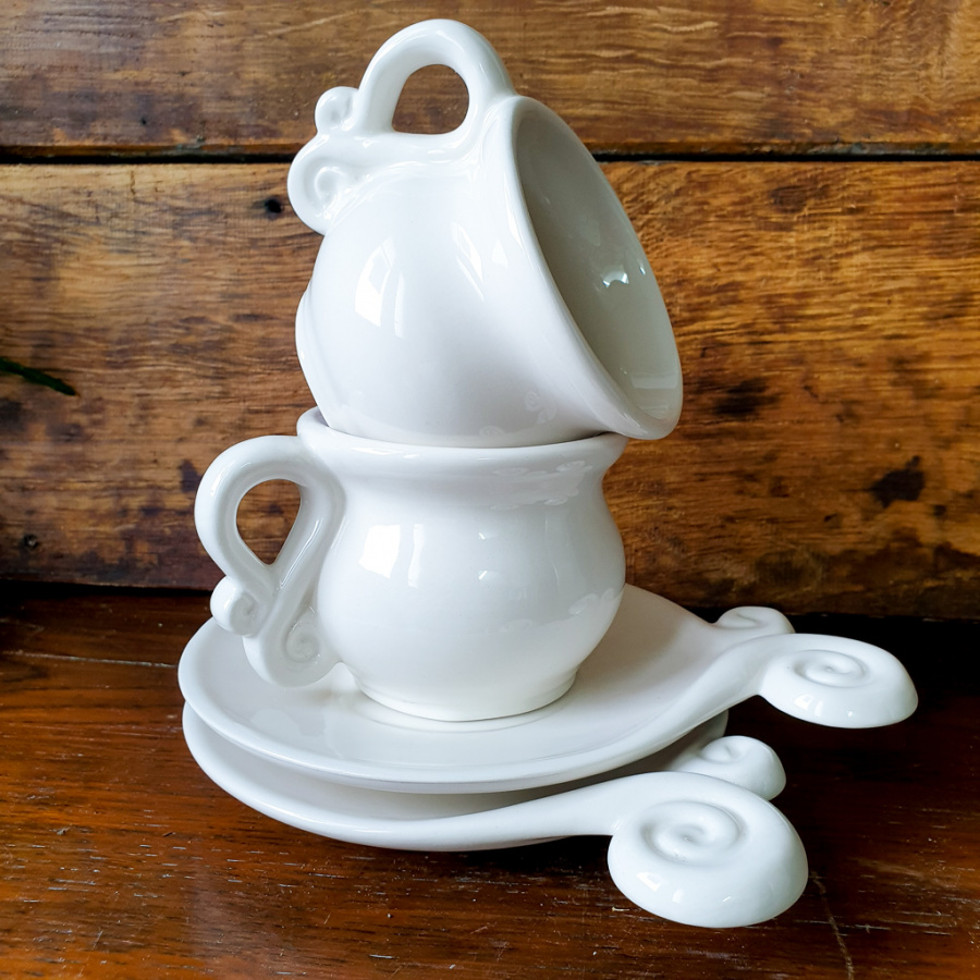 Skodelica bele barve, sijajna glazura, s podstavkom. Čudovita skodelica v kateri je tudi kava boljša.